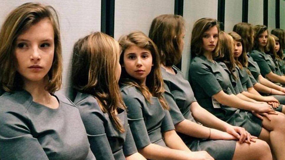 Možná se vám to zdá na první pohled jasné. Řada několika sedících dívek se odráží v jednom zrcadle. Ale je tomu jinak!