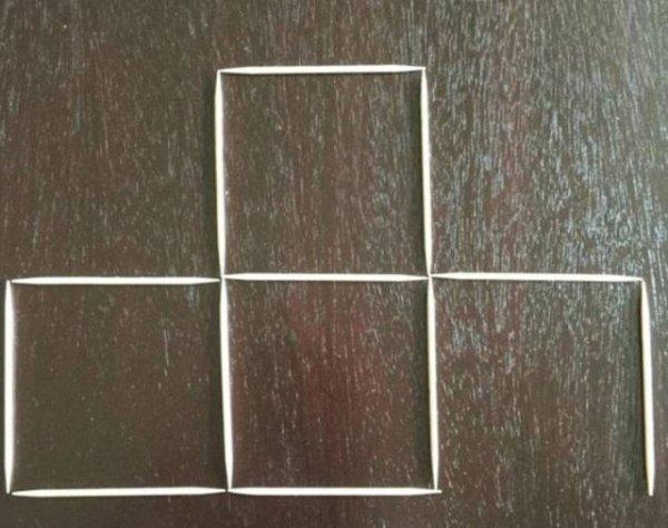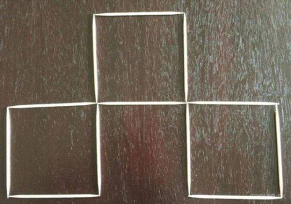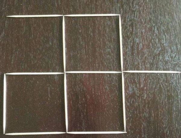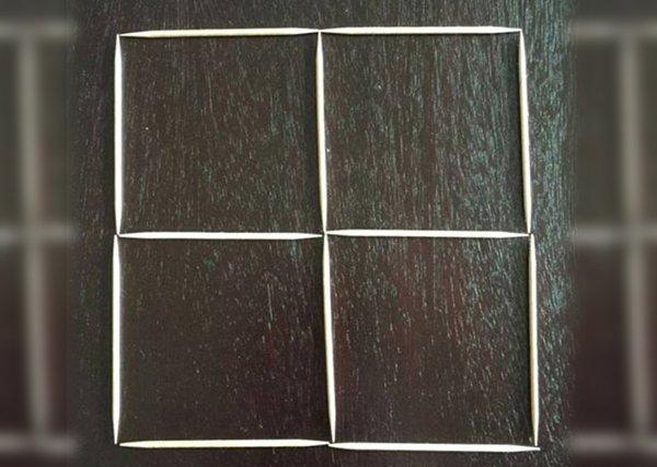 Na prvním obrázku vidíte čtyři čtverce, které jsou složené ze dvanácti párátek. Váš úkol zní: Udělejte z nich tři, a to jen tím, že odstraníte pouhé tři párátka.