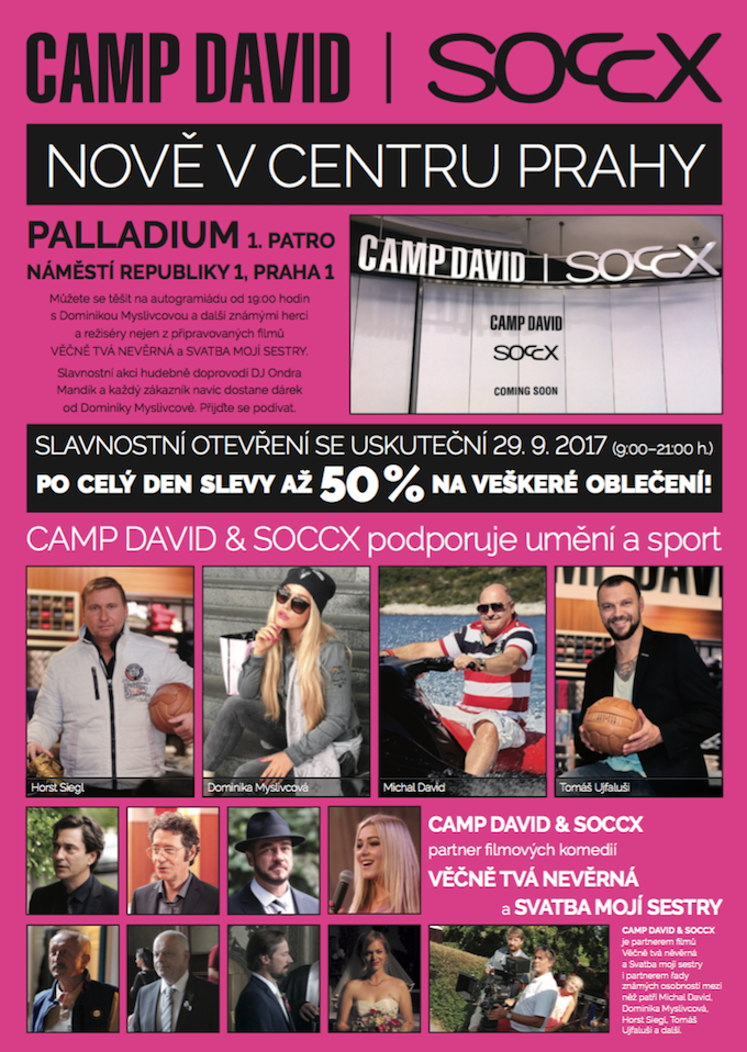 Zmíněná autogramiáda začíná v 19. hodin. Tváří značky je i hitmaker Michal David či bývalí fotbalisté Horst Siegel a Tomáš Ujfaluši. Taková šance nakoupit si věci na zimu nebo vyřešit vánoční dárky už se prostě nikdy nemusí opakovat. A jestli chcete vzít kamarády, žádný problém. Nabídka totiž není nijak omezená, dostane se na každého. A uznejte sami, kde jinde můžete ušetřit takové peníze? Snad jen na bleším trhu, pokud ovšem toužíte po páru obnošených ponožek. U značek Camp David i Soccx je samozřejmostí prémiová kvalita.