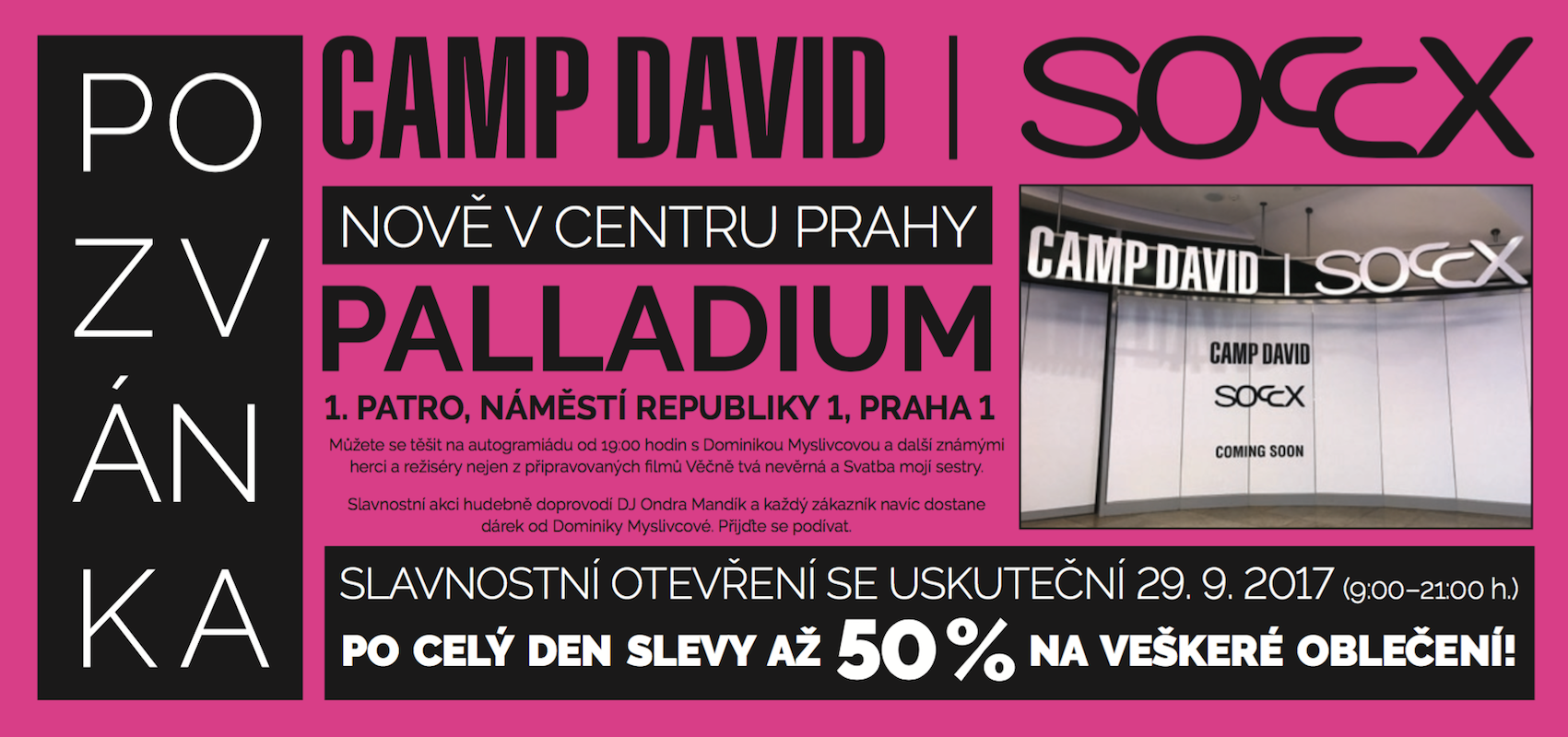 Možná máte pocit, že jste se přehlédli, nebo že jsme se tak trochu zbláznili. Dobrá, pro všechny z vás, kteří nevěří, tedy ještě jednou – 29. září v Palladiu nakoupíte v novém butiku značky Camp David se slevou až padesát procent! Ale pozor, to nebude zdaleka všechno. Jelikož si outfity Camp David oblíbila i řada celebrit, můžete se například těšit na autogramiádu youtuberky a blogerky Dominiky Myslivcové, která každému, kdo si něco koupí, dá malý dárek ze své kolekce. Dorazí i herci z nových filmů „Svatba mojí sestry“ a „Věčně tvá nevěrná“, které značka podporovala a stala se také partnerem obou snímků.